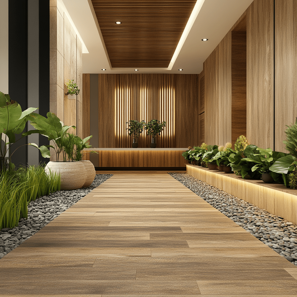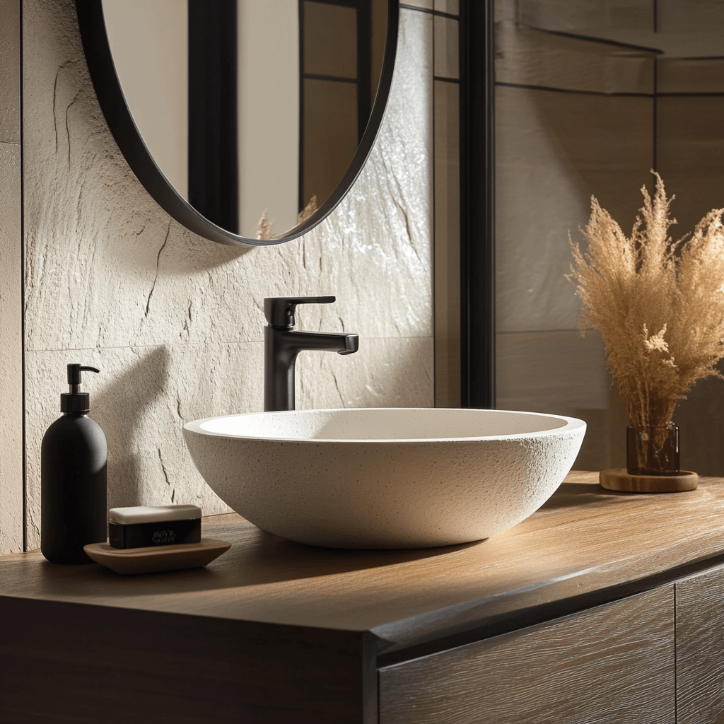 Wall and floor tiles provide durability, water resistance, and versatile design options, featuring materials like ceramic