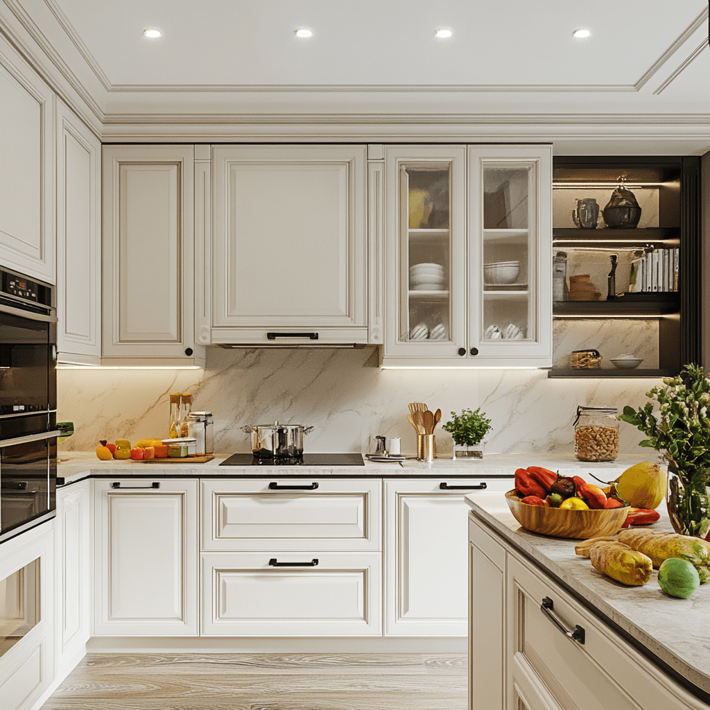 Cabinets are made from materials like melamine, PET, shaker style, lacquer finishes, and veneer, offering durability, elegance, and versatility.