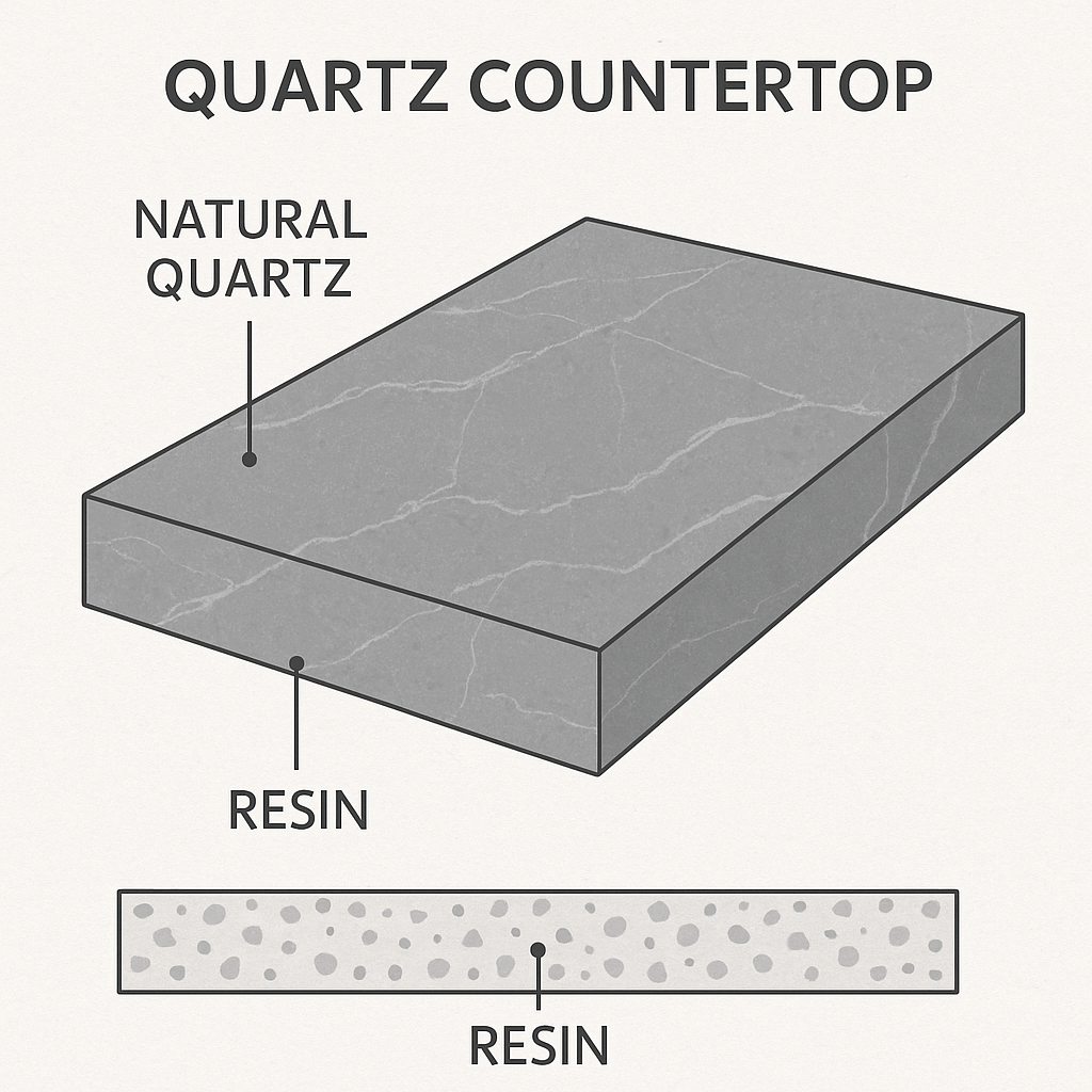 Quartz countertops offer a refined, modern surface designed for both beauty and performance. Made from over 90% natural quartz combined with advanced resins, this engineered stone delivers exceptional durability with a luxurious, consistent finish. Its non-porous structure makes it highly resistant to stains, scratches, heat, and bacteria—perfect for kitchens, bathrooms, and commercial interiors.